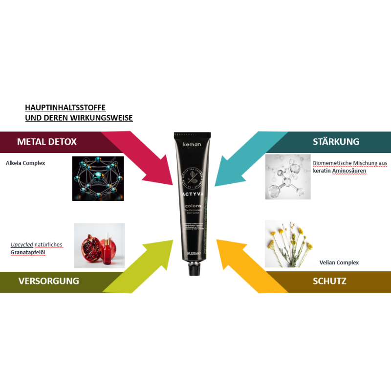 Actyva Coloro ist ein professionelle Colorationssystem, das aus zwei unterschiedlichen Farbbehandlungen besteht: Actyva Coloro Demi-Permanent und Actyva Coloro The Permanent Hair Color. Die einzigartige Alkela-Technologie fängt Metallionen ein und sorgt für einen revolutionär sauberen und reinen Farbprozess. Aber nicht nur dass – Actyva Coloro The Permanent Hair Color tönt und hellt das Haar in nur einem Schritt auf, bei maximaler Berücksichtigung und Pflege von Haut und Haar.